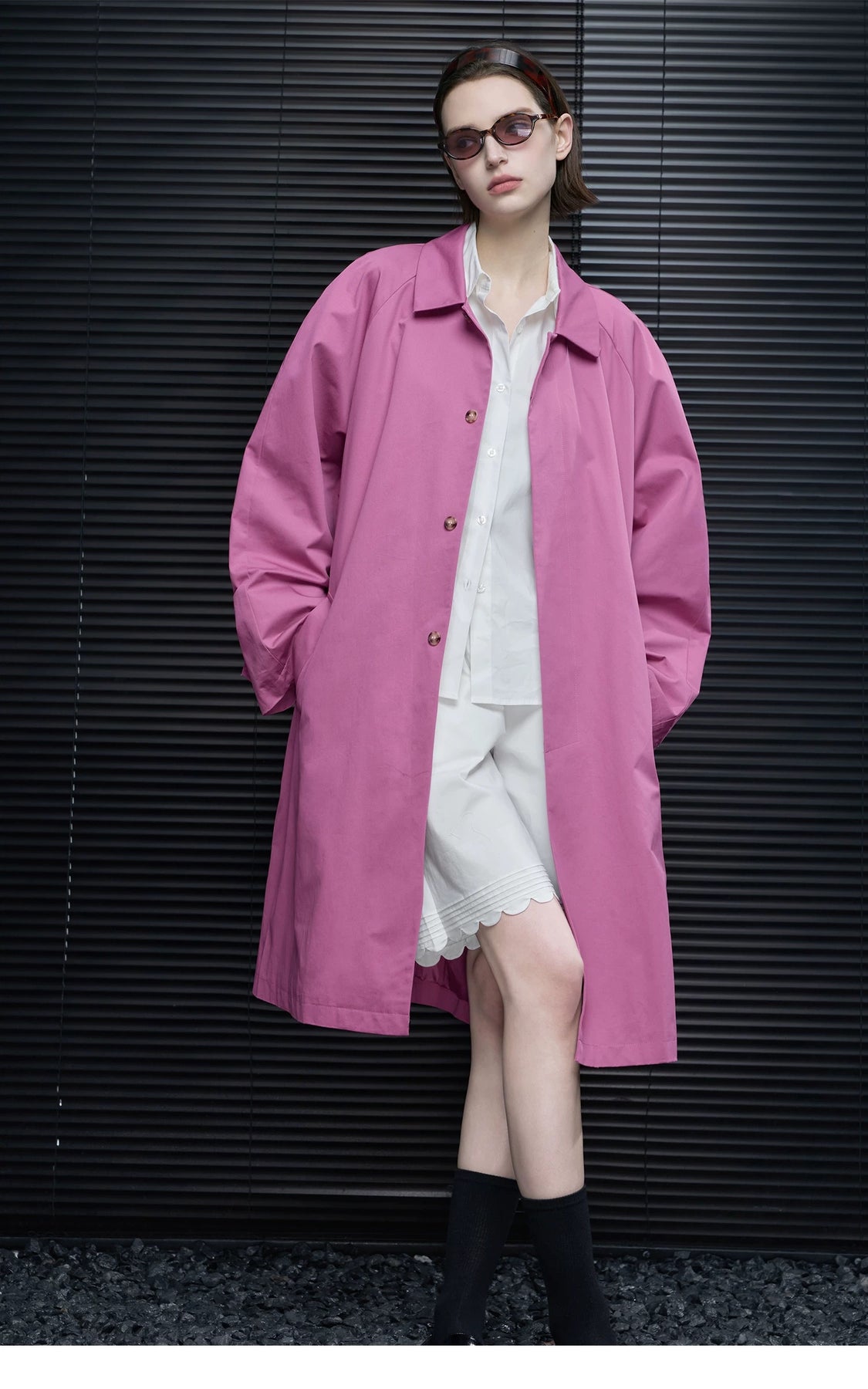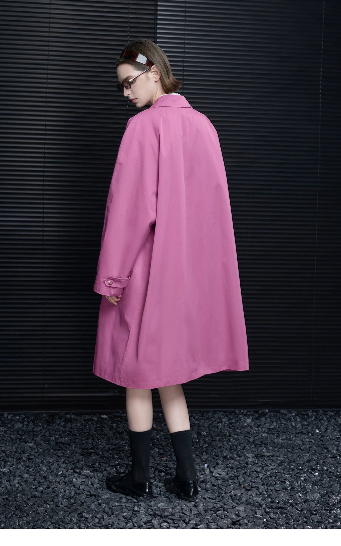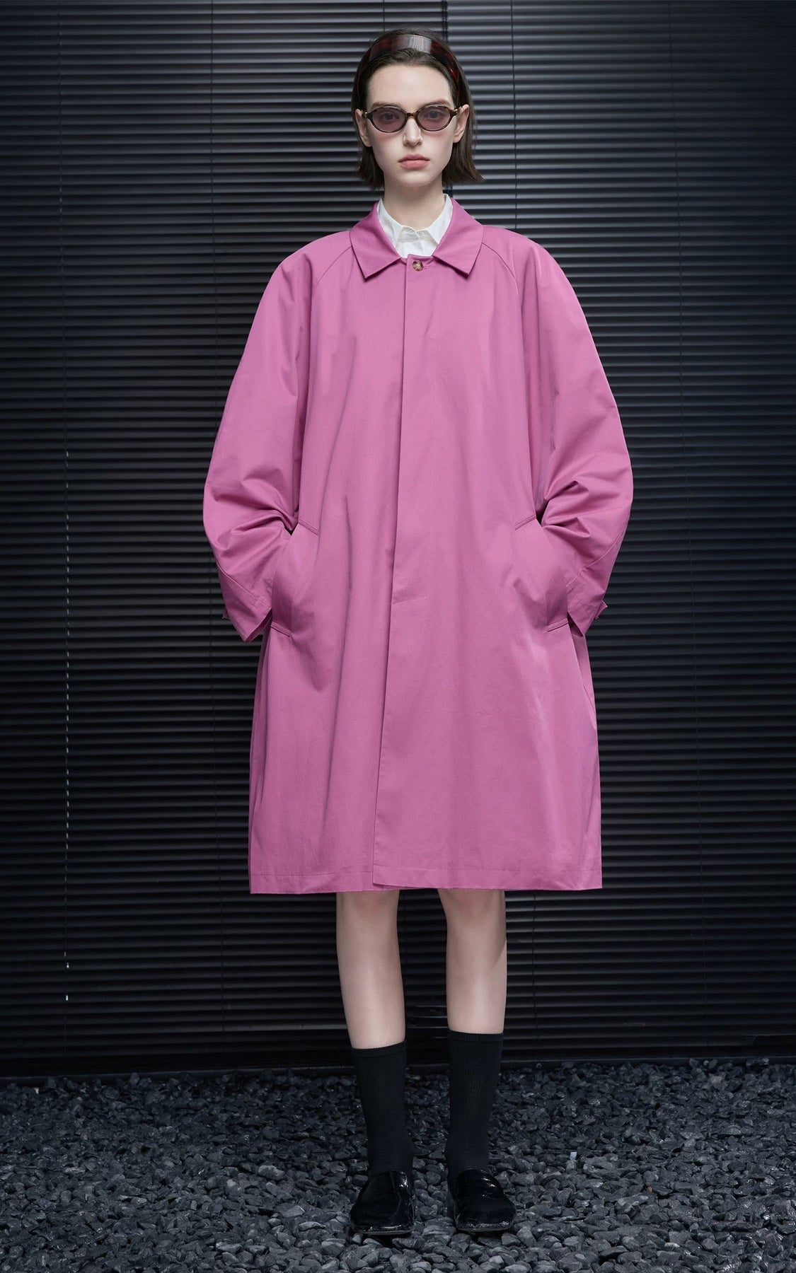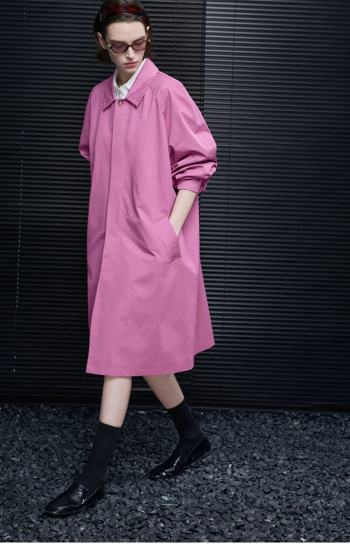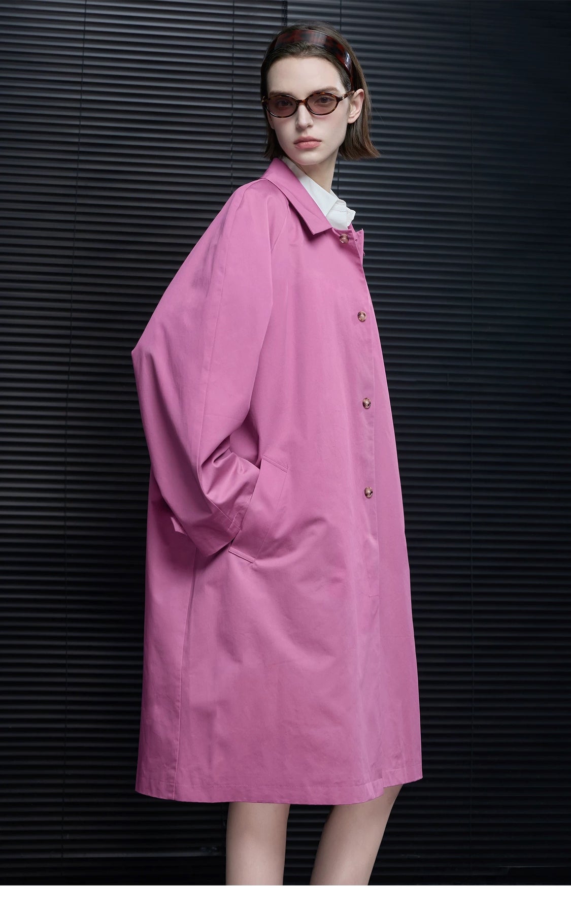 春らしいタフィーピンクのステンカラーコート